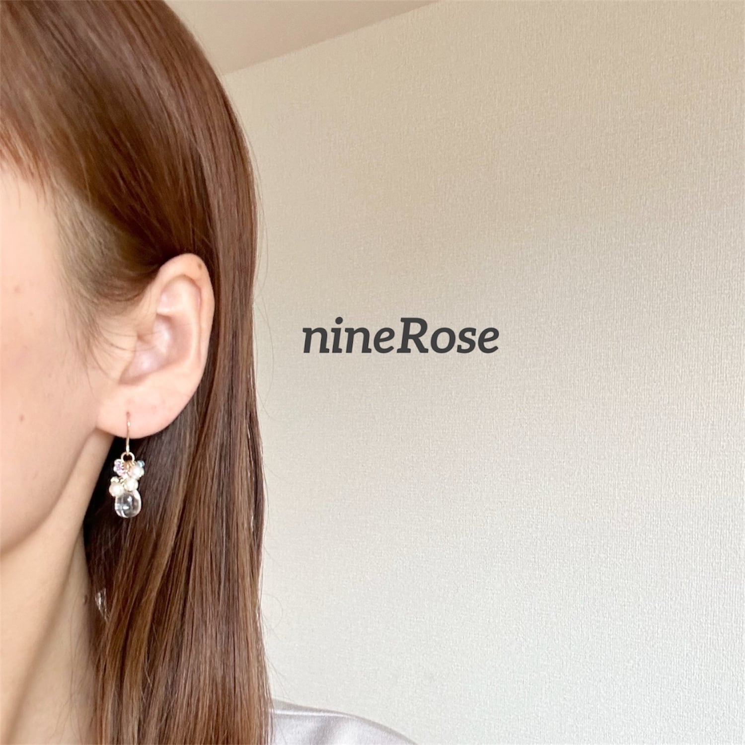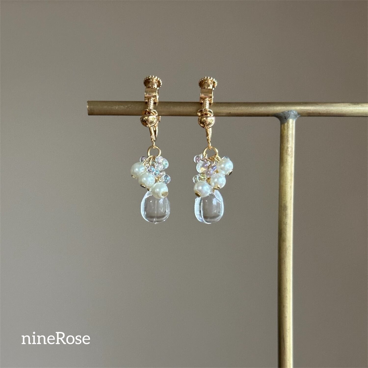 控えめなクリーム色のガラスパールに、オーロラのつぶつぶガラスとうるうる雫ビーズを合わせて透明感もプラスしました♡