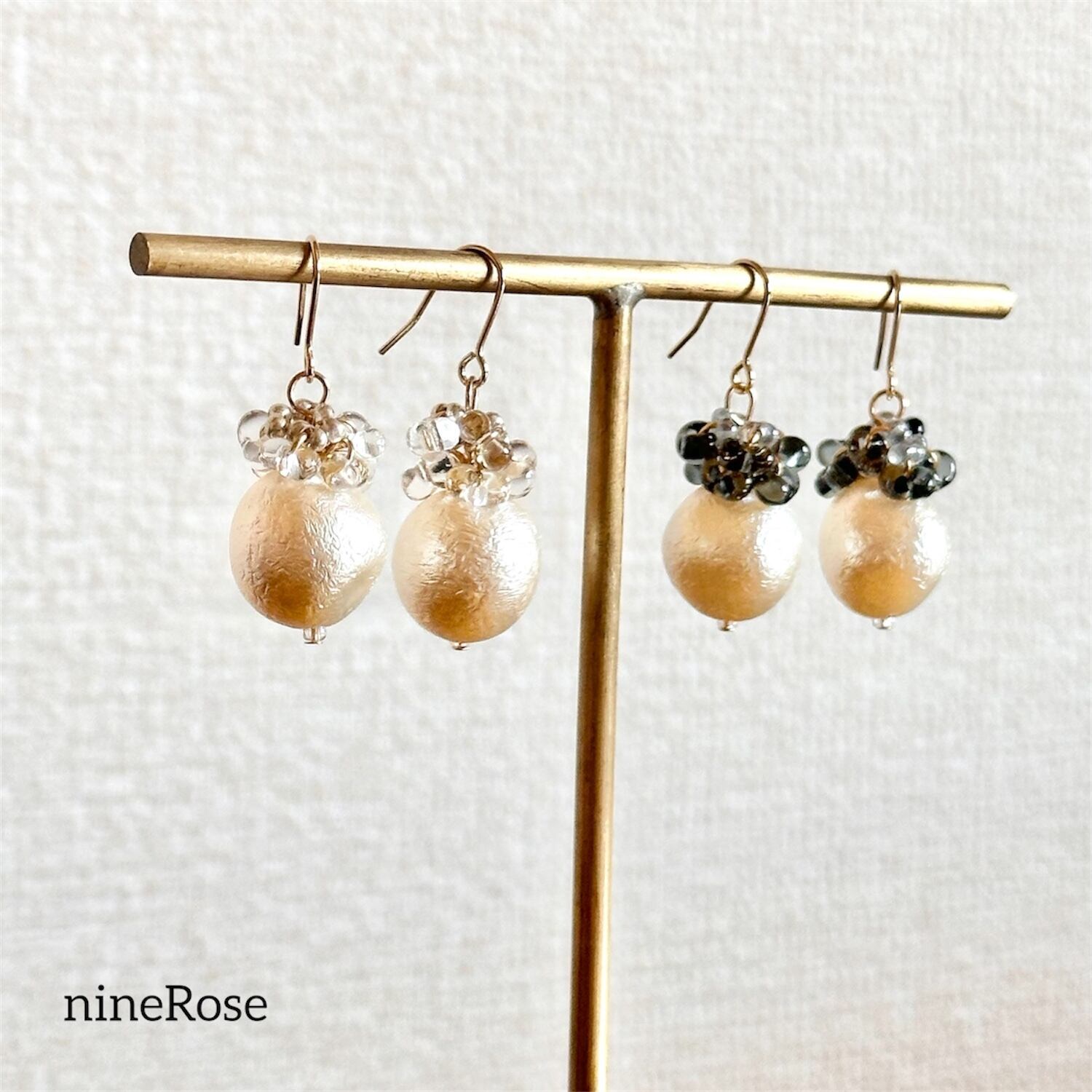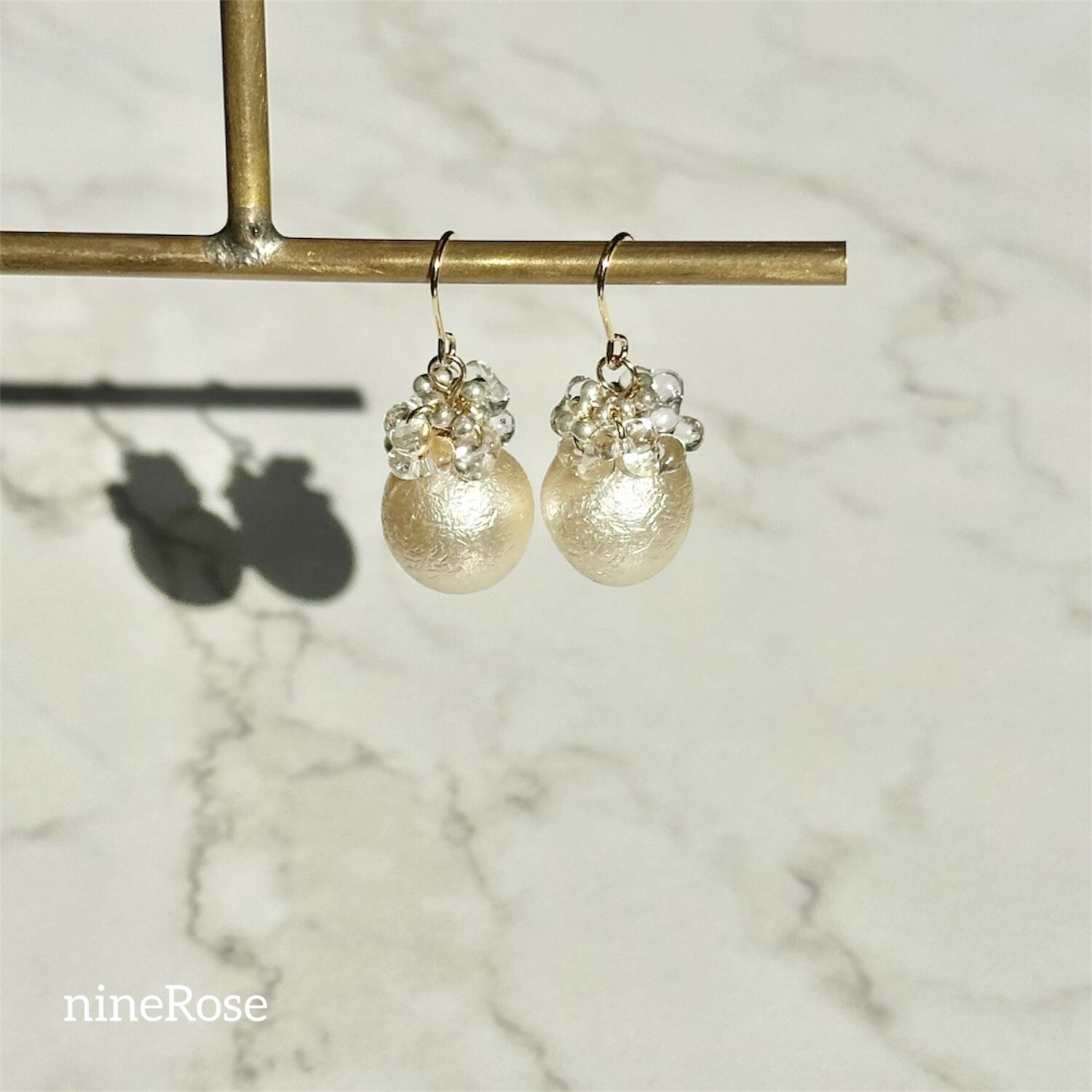 ぽこぽこと歪なフォルムが印象的な大粒パール に透明感溢れるつぶつぶガラスを合わせた、シンプルでありながらゴージャスなデザインのアクセサリーです!