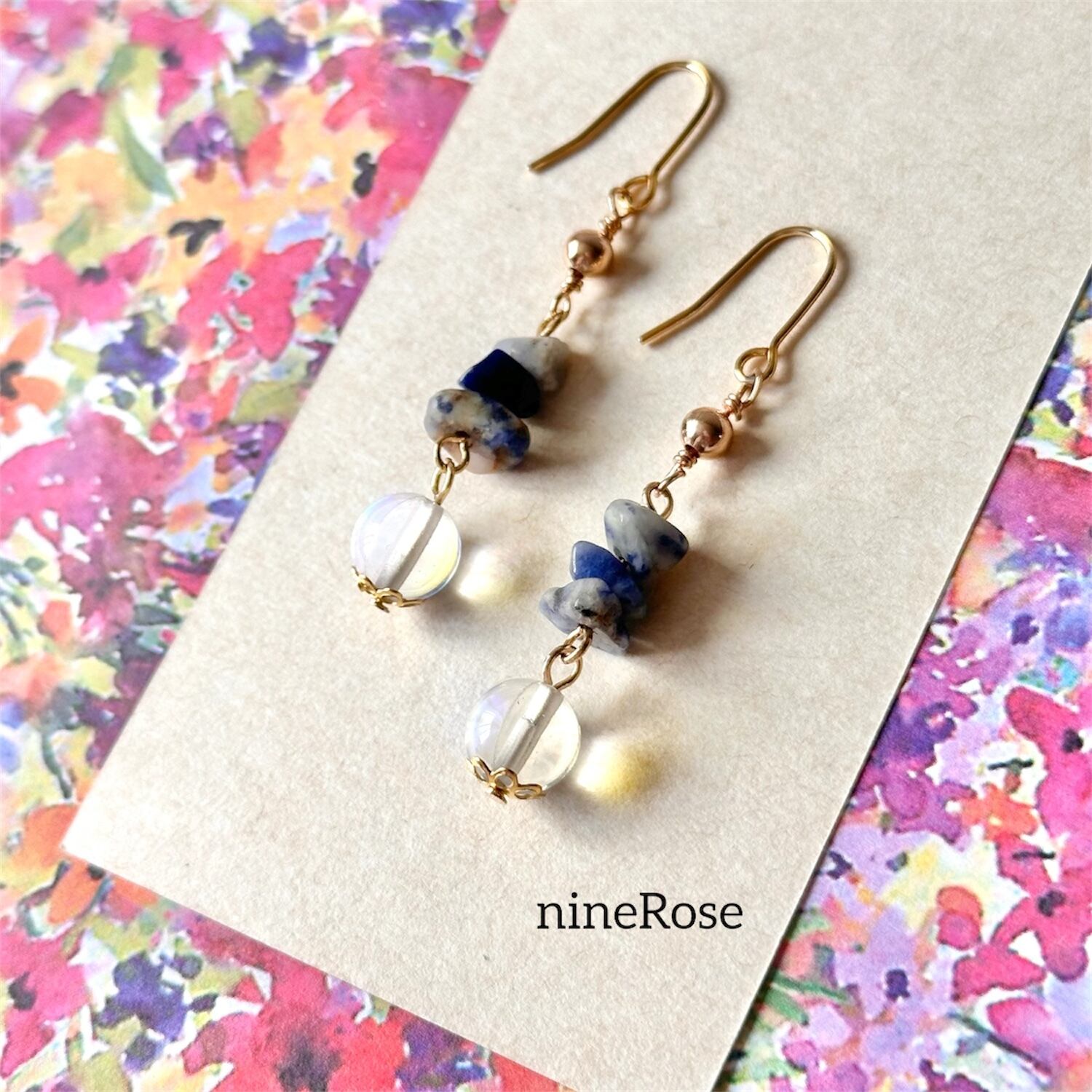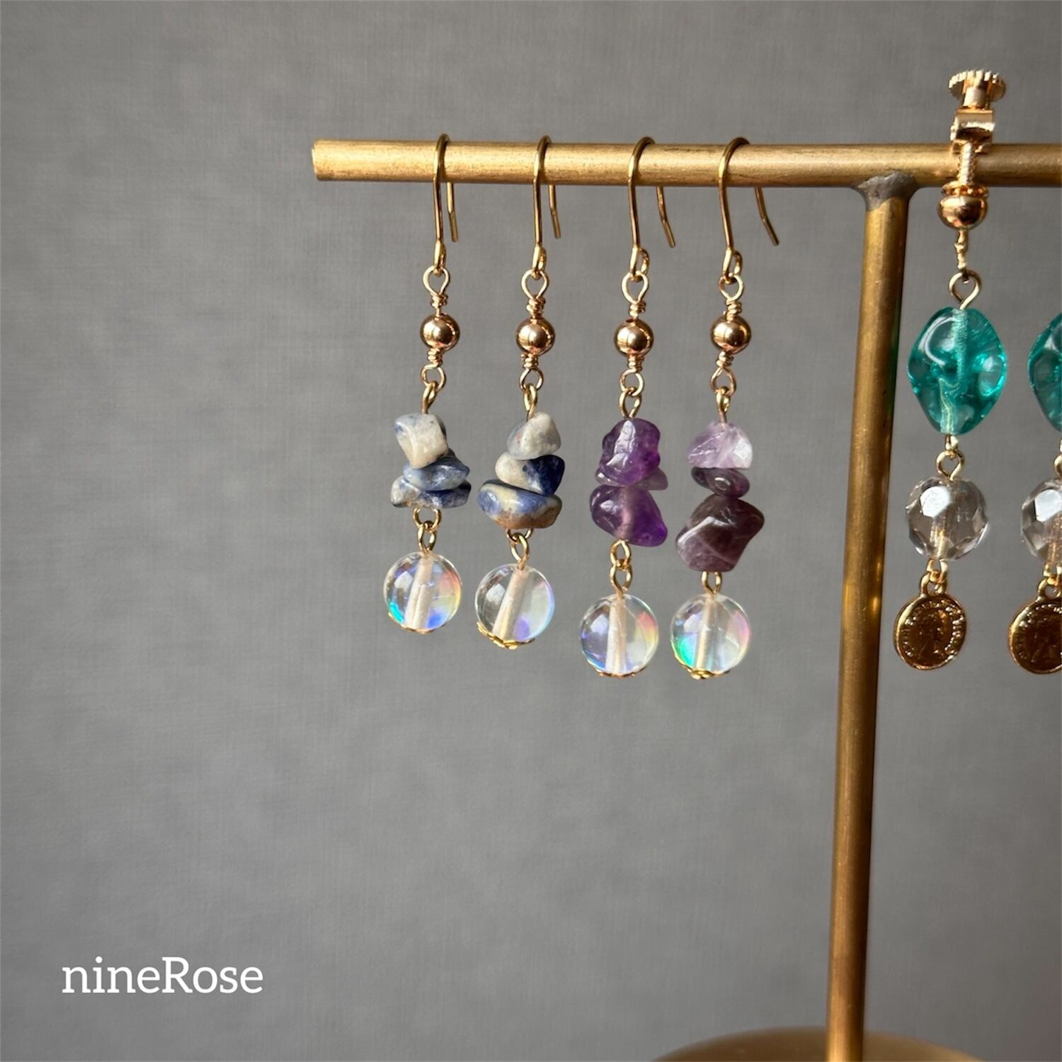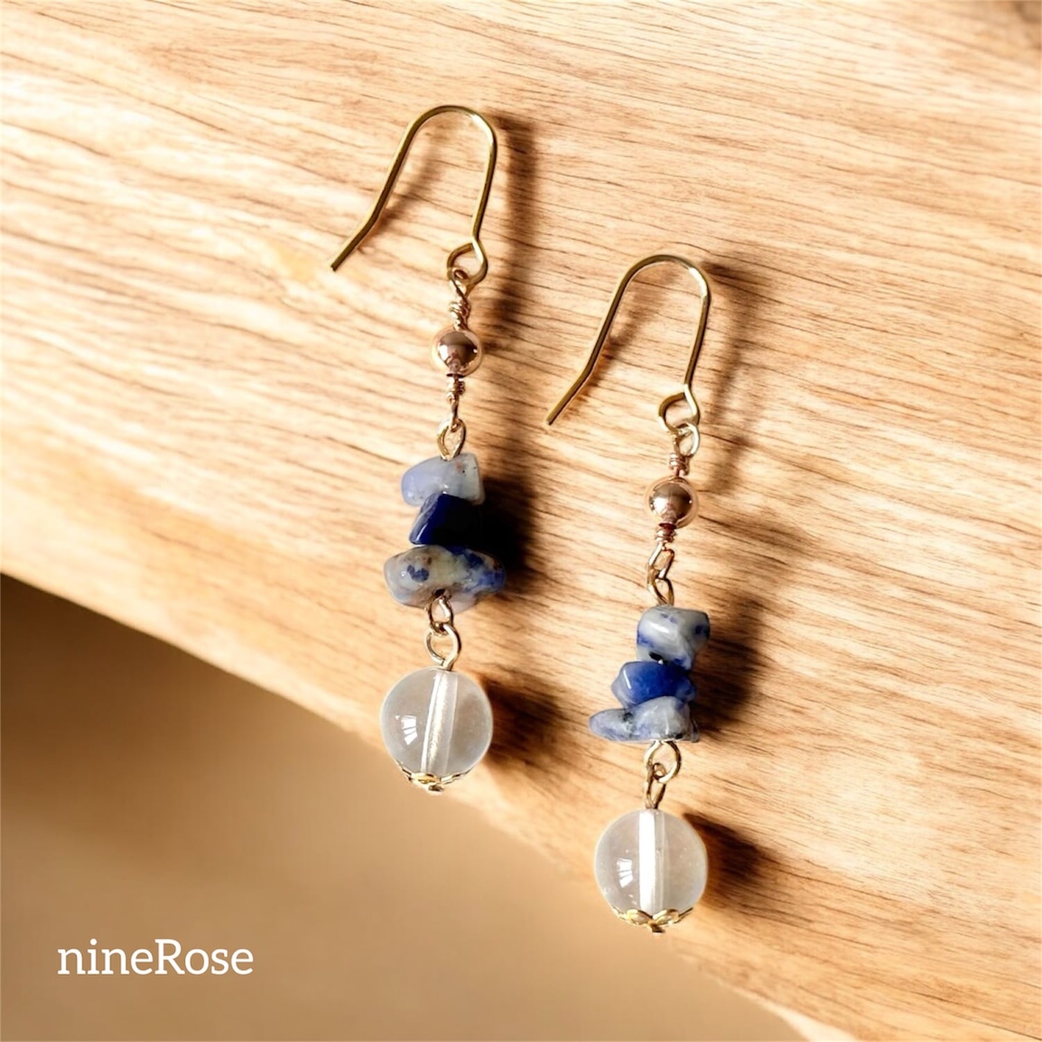水晶加工されたガラスビーズに、神秘的な美しさを持つラピスラズリのさざれ石を合わせたピアスです♪