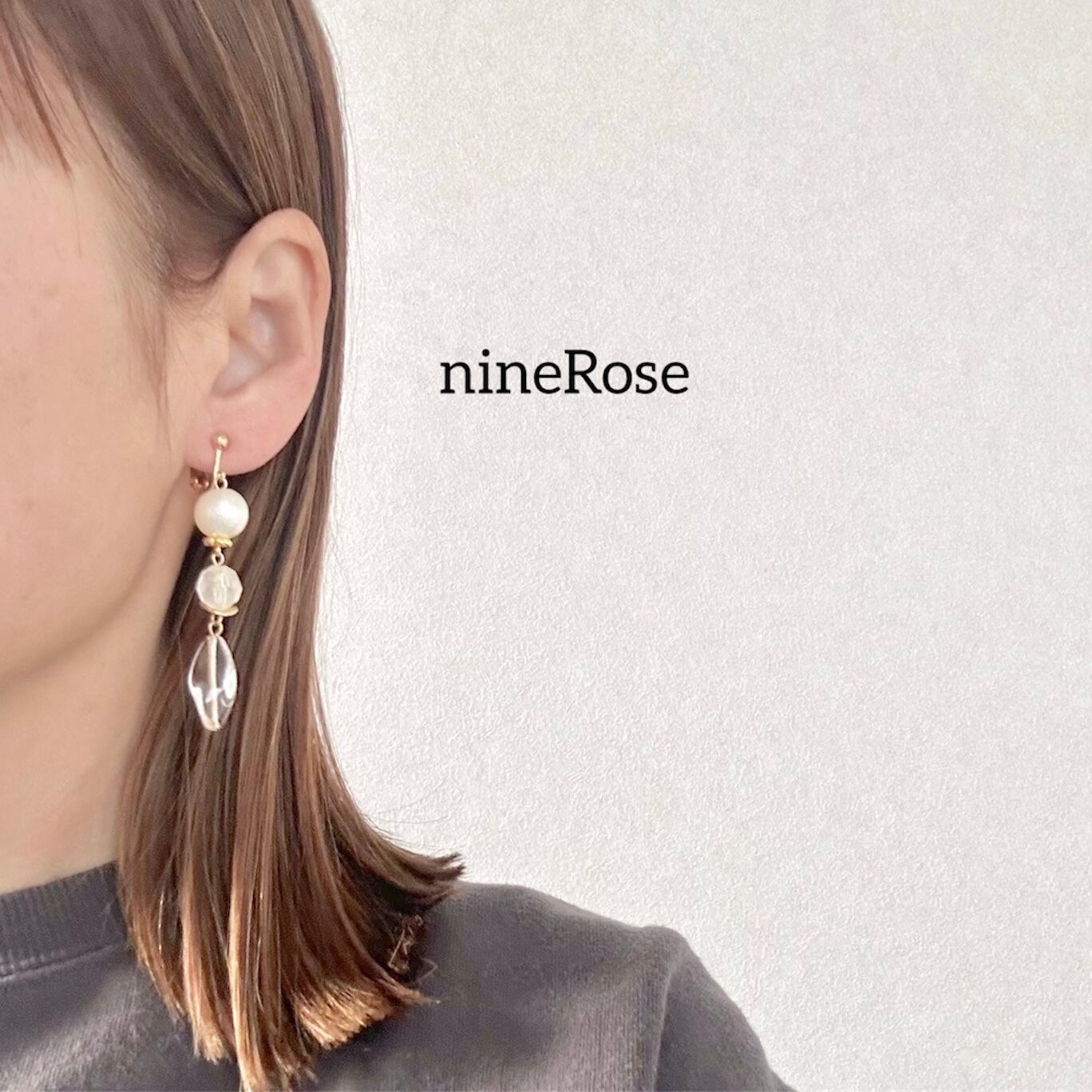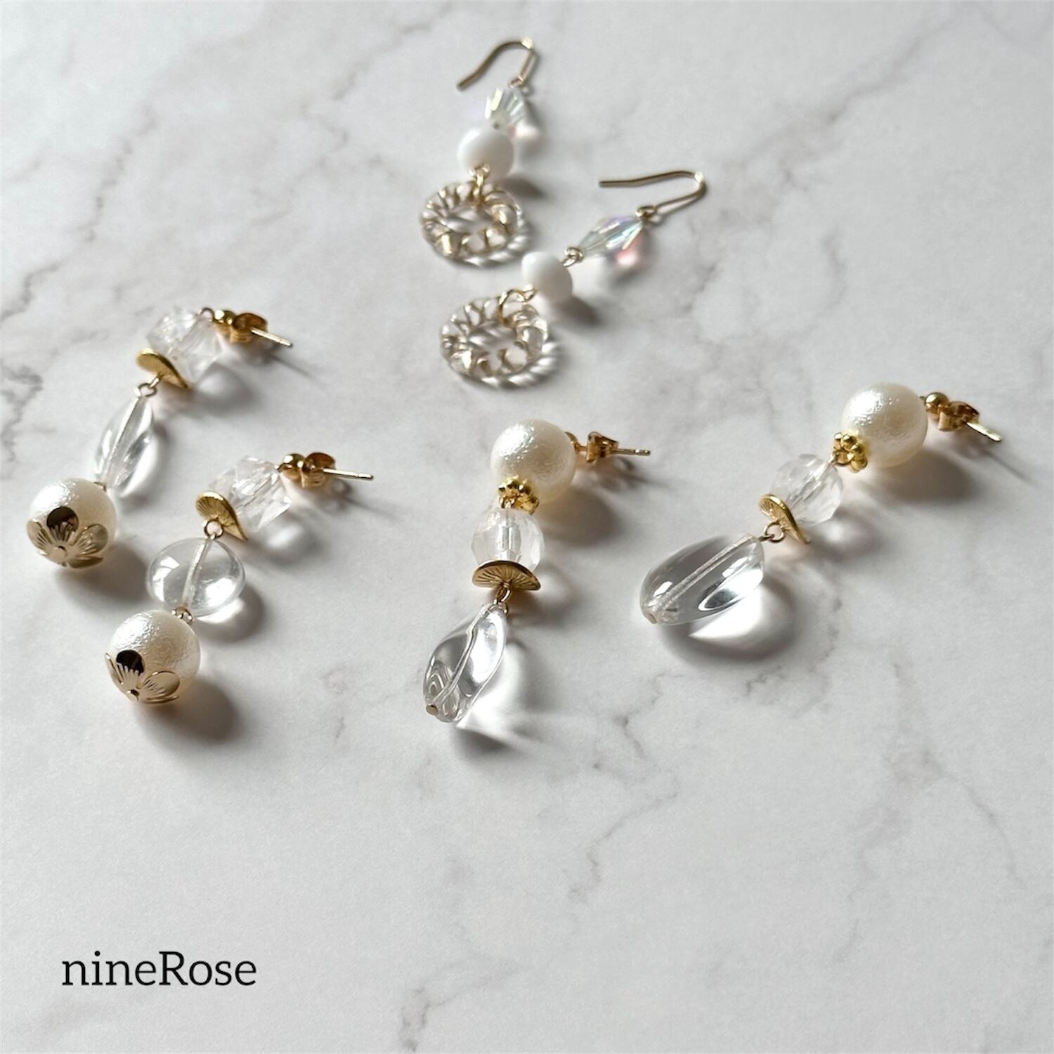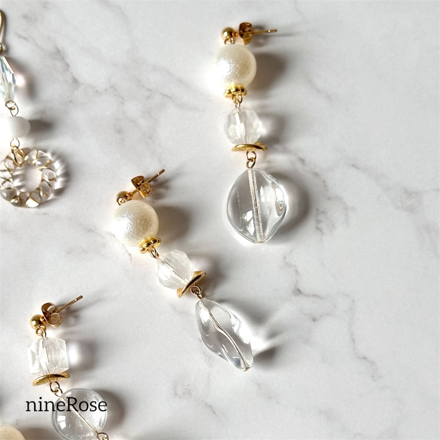 クリアな透明感を持つチェコビーズに、エレガントなパールを組み合わせたアシンメトリーデザインのアクセサリーです。